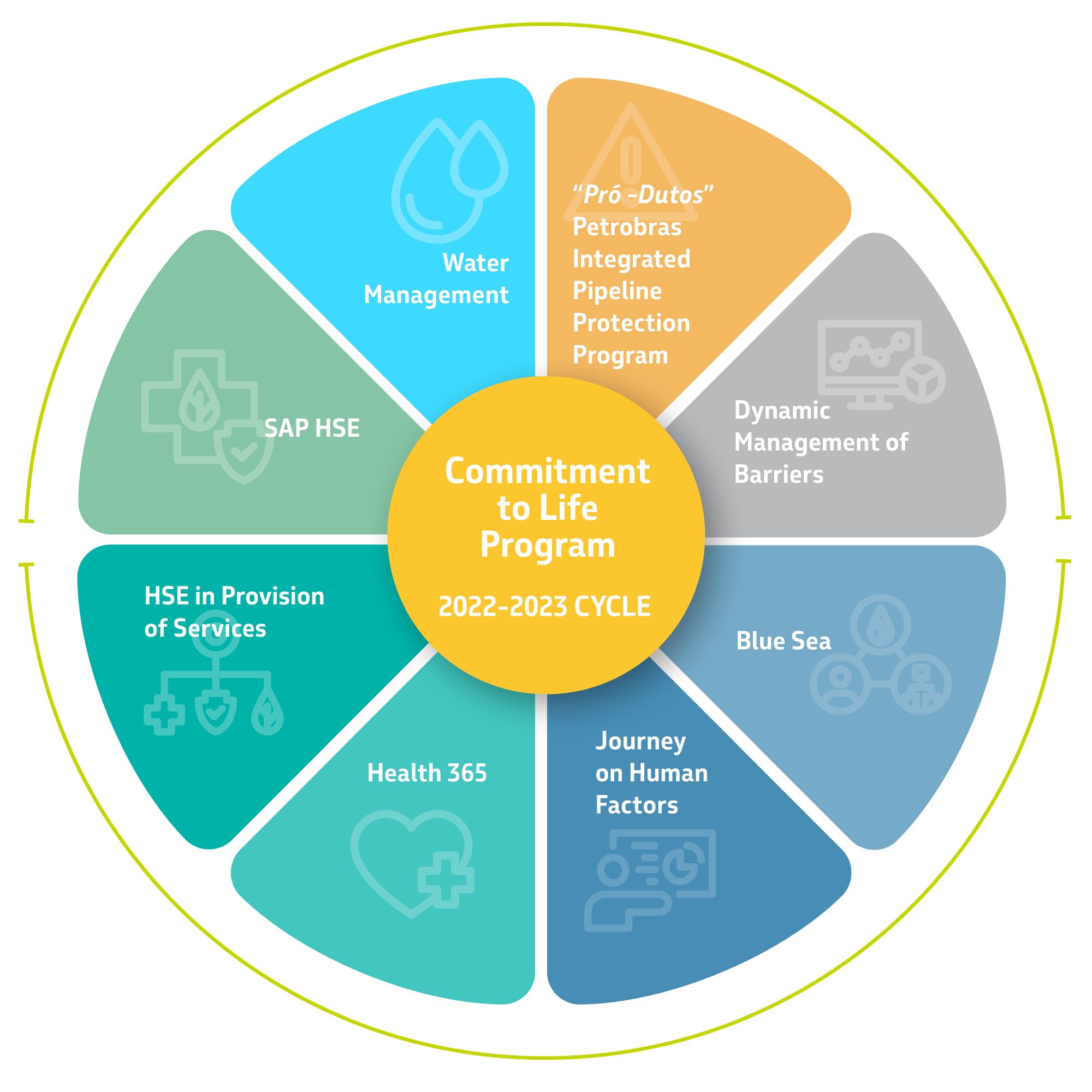 Our ESG mandala guides planning and engagement with stakeholders and is aligned with the company's strategic elements and objectives. In it, four key ideas are highlighted, one of which is caring for people. In this area, one of the commitments assumed involves the promotion of safe operations, based on the protection of life, training 100% of the leadership in mental health, and working to promote the well-being of more than 38 thousand employees. Our goal is that, at the end of their work day, each employee can return healthy and safe to their family, and for this reason, in October 2016, we launched the Commitment to Life Program. The Program is composed of structuring projects defined based on the critical analysis of Health, Safety, and the Environment (HSE) management, with reference to the best market practices, and its sixth cycle was initiated and developed throughout 2022, with the following highlights:
