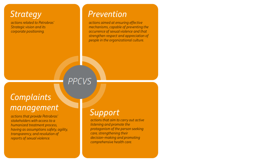 Aiming to provide a diverse, respectful, safe, and sexual violence-free work environment, in May 2023, we launched the Petrobras Program against Sexual Violence (PPCVS), which centralizes and monitors the execution of actions carried out, and to be implemented, to combat harassment, sexual harassment and violence. The program has been developing actions in four axis: