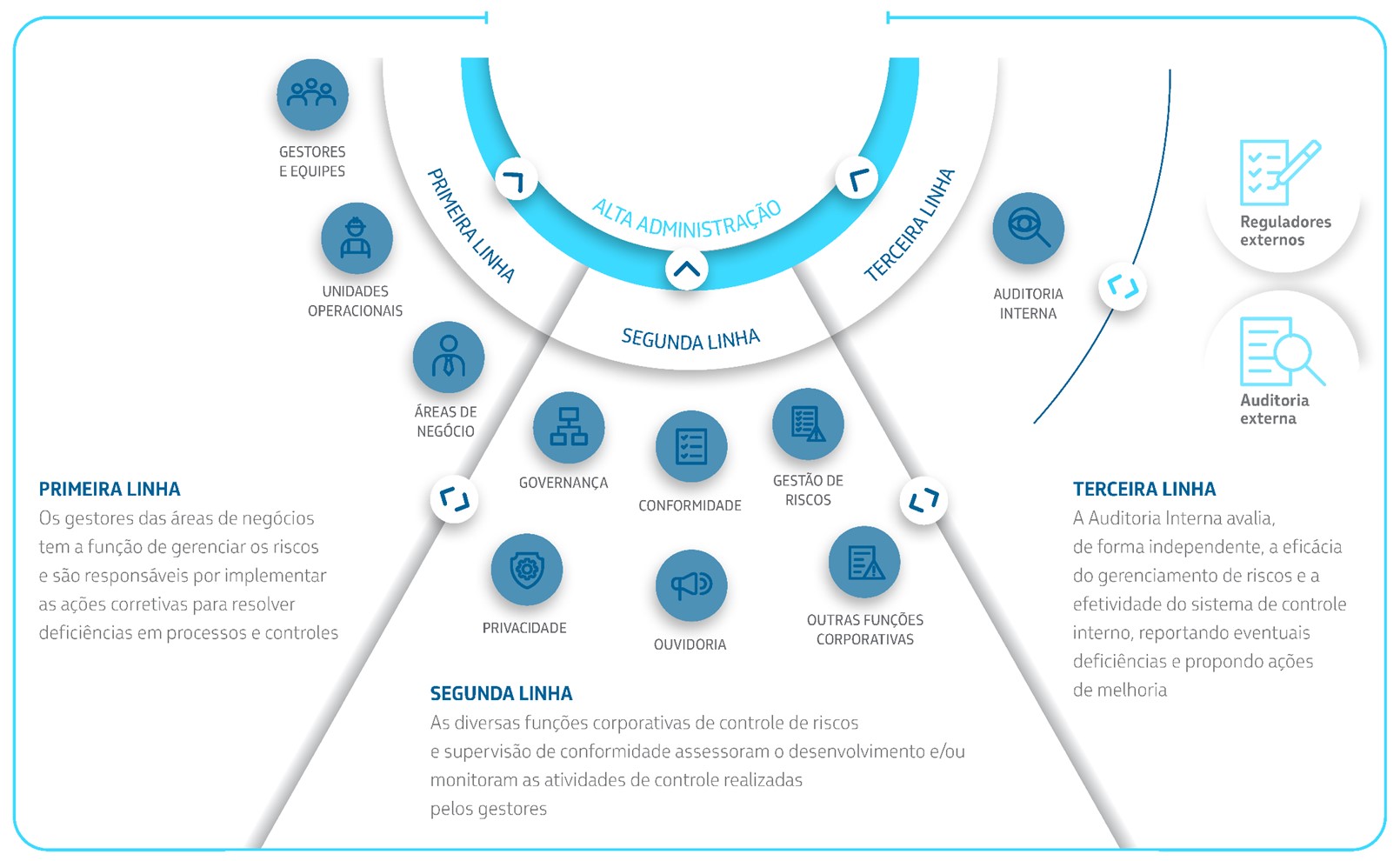 Nosso gerenciamento de riscos direciona nossas ações de integridade e fortalece os nossos controles internos e a nossa governança. A nossa Política de Gestão de Riscos Empresariais define, em um de seus princípios, que tal gestão se insere em nosso compromisso de atuar de forma ética e em conformidade com os requisitos legais e regulatórios estabelecidos nas jurisdições onde atuamos.